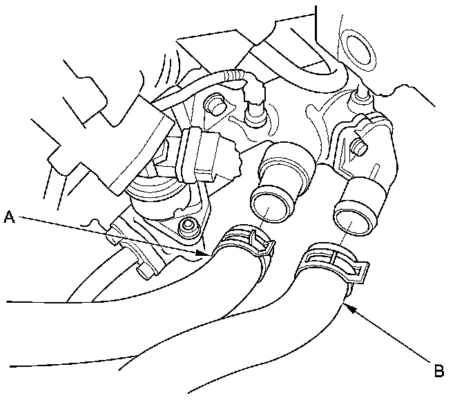 47. Disconnect the upper radiator hose (A) and the lower radiator hose (B).