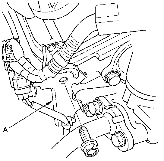 50. Remove the connector bracket (A) from the front cylinder head; use the bracket bolt hole to attach the engine hanger balance bar front arm.