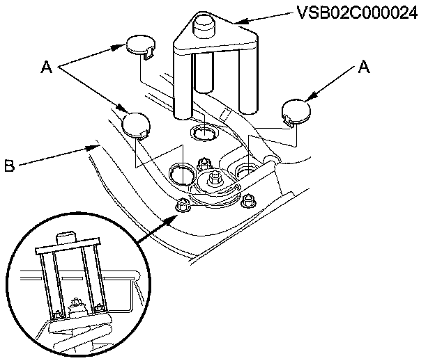 52. Remove the service caps (A) for the front damper flange nuts from the cowl cover (B). Position the engine hanger adapter set (VSB02C000024) with the "FRONT" mark facing forward over the damper flange nuts.
