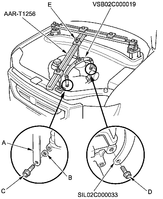 54. Install the engine support hanger (AAR-T1256) onto the vehicle as shown, and attach the hook to the slotted hole in the engine hanger balance bar. Tighten the wing nut (E) by hand, and lift and support the engine/transmission.