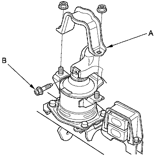 55. Remove the front engine mount stop (A), then remove the front engine mount mounting bolt (B).