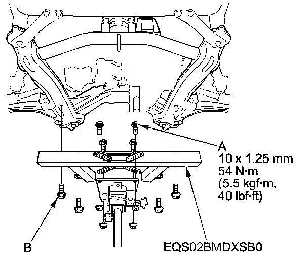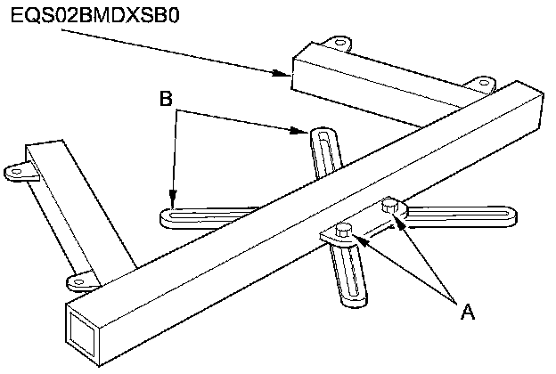 57. Loosen the four bolts (A) holding the adjustable arms (B) of the front subframe adapter (EQS02BMDXSB0) to its center plate.