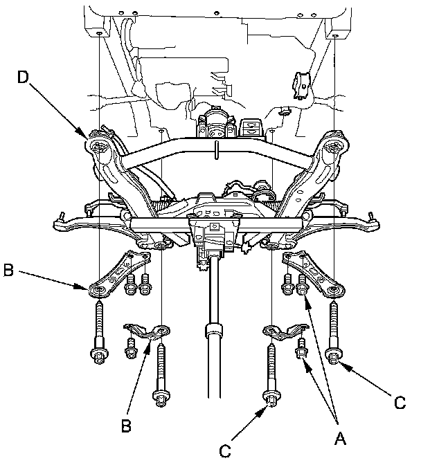 61. Remove the six 12 x 1.25 mm bolts (A) securing the subframe stiffeners (B), the four subframe mounting bolts (C), and the stiffeners, then lower the front subframe (D).