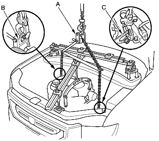 63. Attach a chain hoist (A) to the engine hanger (B) and the transmission hanger (C), then lift the engine/transmission until it's securely supported by the chain hoist and remove the engine support hanger, the engine hanger balance bar, and the engine hanger adapter set.