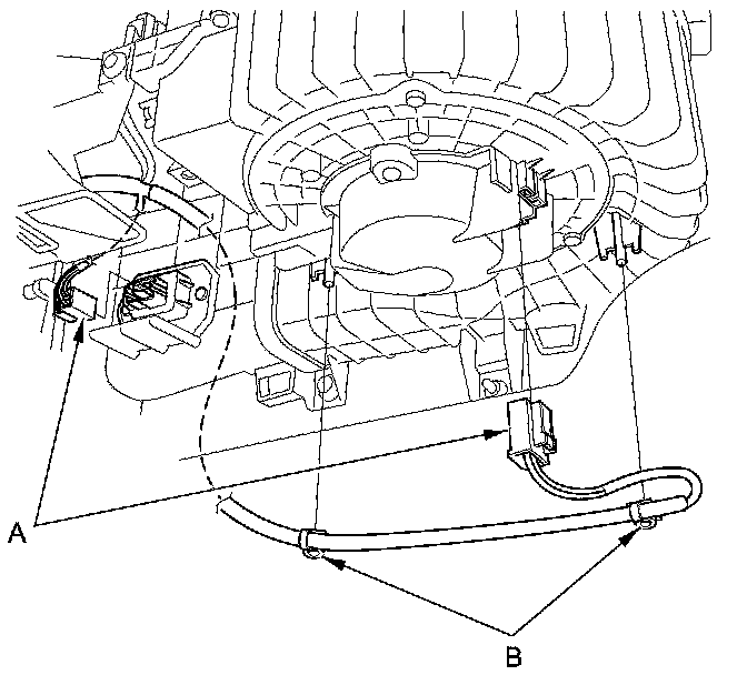 4. Disconnect these connectors (A) from the blower motor and the power transistor, then remove the wire harness clips (B).
