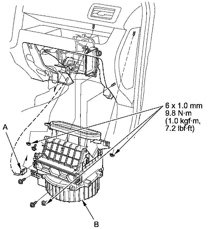 5. Disconnect the connector (A) from the recirculation control motor, then remove the self-tapping screws, the mounting nuts, and the blower unit (B).