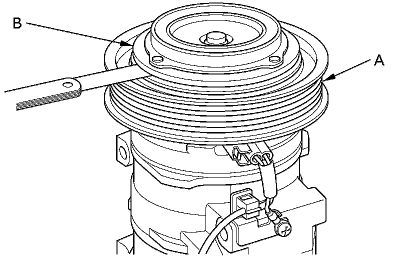 3. Measure the clearance between the pulley (A) and the pressure plate (B) all the way around. If the clearance is not within specified limits, remove the pressure plate Service and Repair and add or remove shims as needed to increase or decrease clearance.