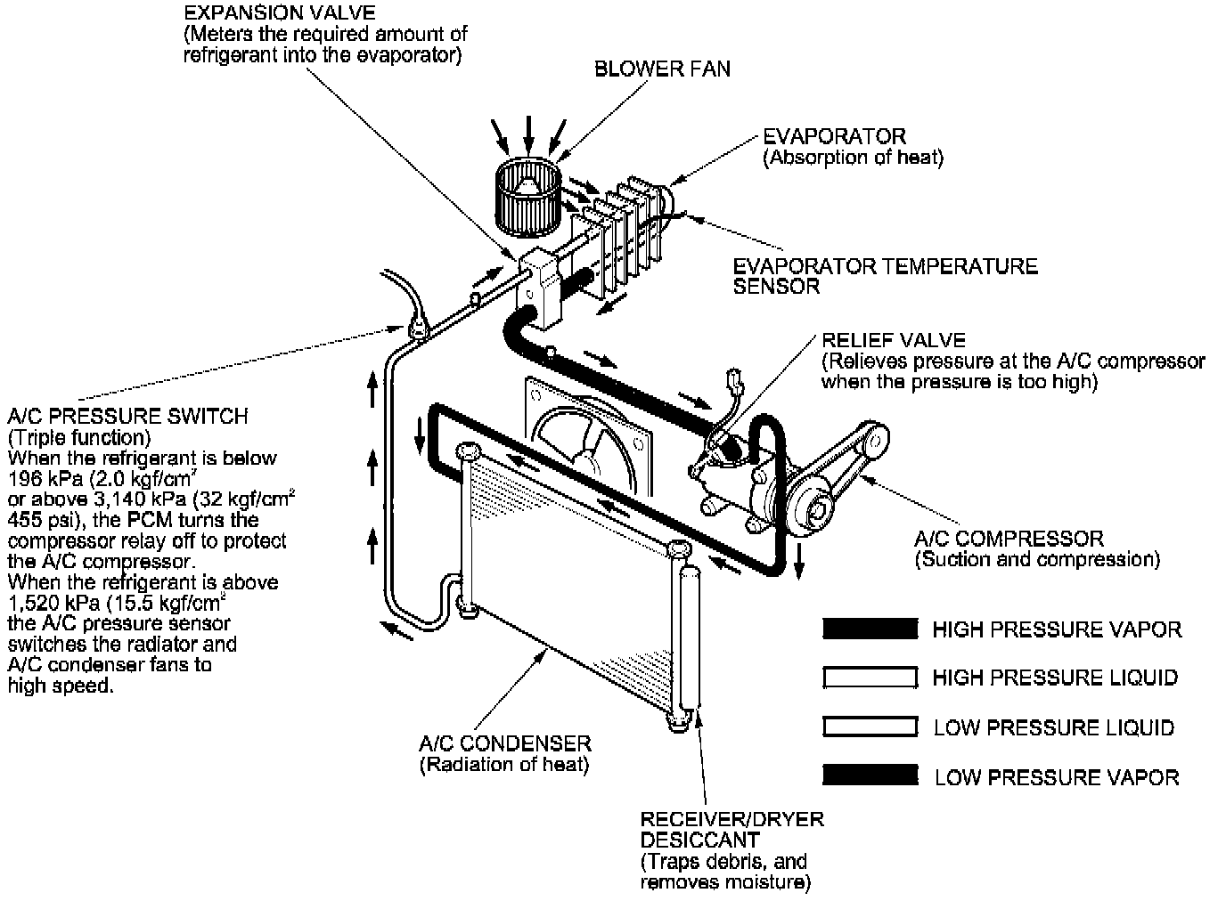 If the refrigerant pressure goes above 1,520 kPa (15.5 kgf/cm2, 221 psi), the A/C pressure switch closes to signal the PCM to change the speed of the A/C condenser fan and radiator fan to high. When the refrigerant pressure drops below 930 kPa (9.5 kgf/cm2, 135 psi), the A/C pressure switch opens to signal the PCM to change the speed of the A/C condenser fan and radiator fan to low.