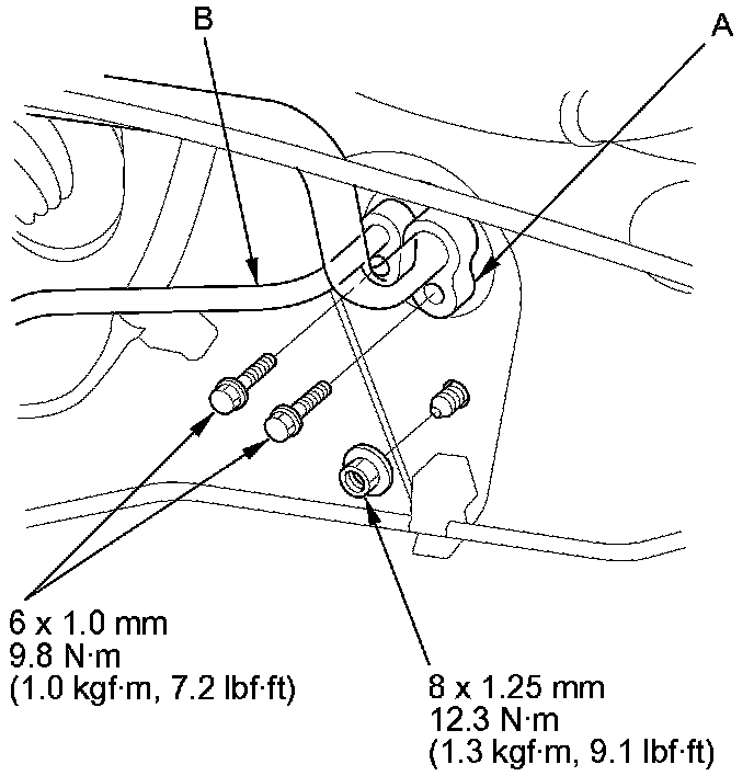 2. Remove the bolts and nut, then disconnect the suction line (A) and receiver line (B) from the evaporator core.