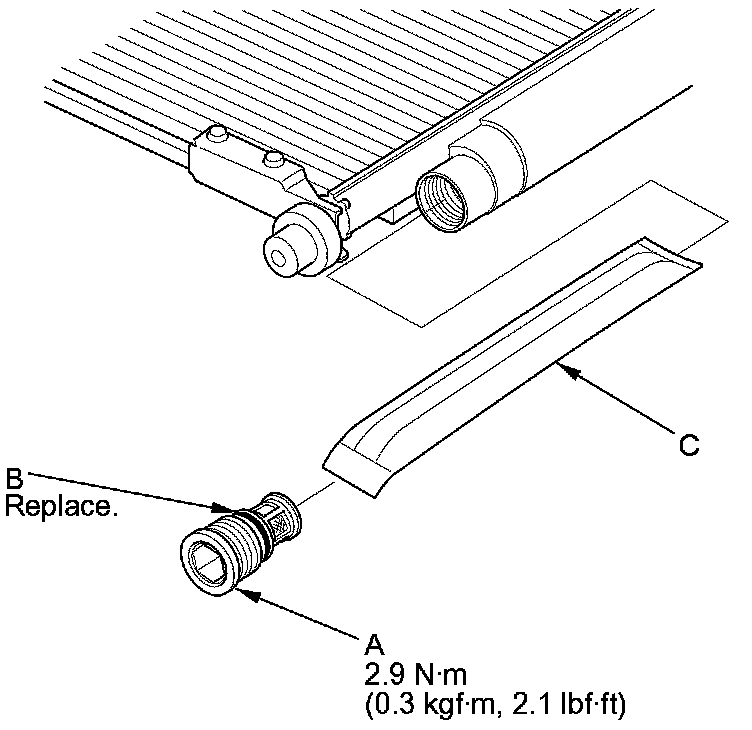 2. Remove the cap (A) from the bottom of the A/C condenser. Remove the O-ring (B) and the desiccant (C).