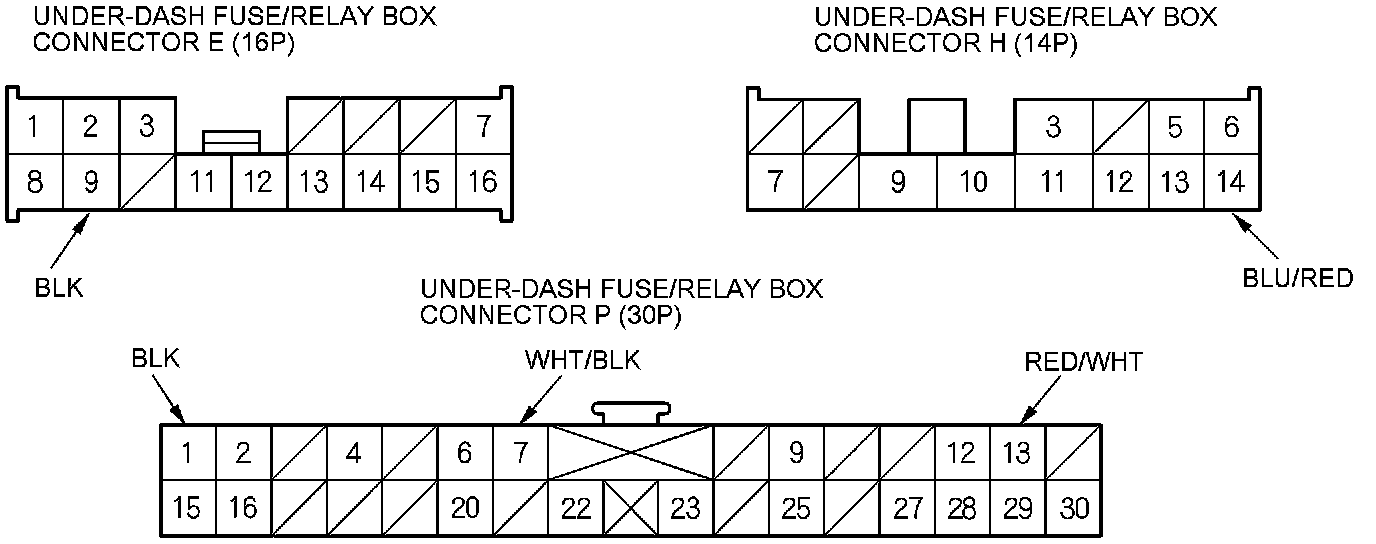 3. Disconnect under-dash fuse/relay box connectors E, H, and P.