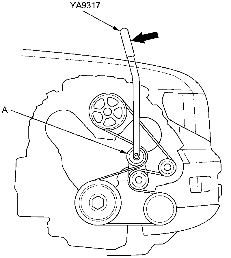 1. Move the auto-tensioner (A) using the belt tension release tool in the direction of the rotation arrow to relieve tension from the drive belt, then remove the drive belt.