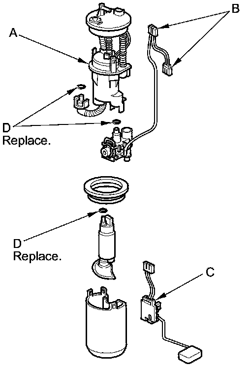 4. Install the parts in the reverse order of removal with new O-rings (D). When installing the fuel tank unit, align the marks on the unit and the fuel tank Fuel Tank Unit Removal/Installation.