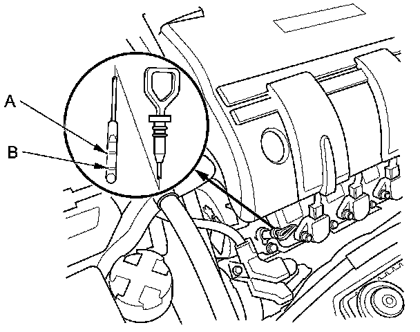 3. Remove the dipstick, and check the engine oil level. It should be between the upper mark (A) and lower mark (B).