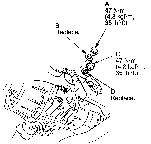3. Remove the drain plug (C) and the sealing washer (D), and drain the fluid.
