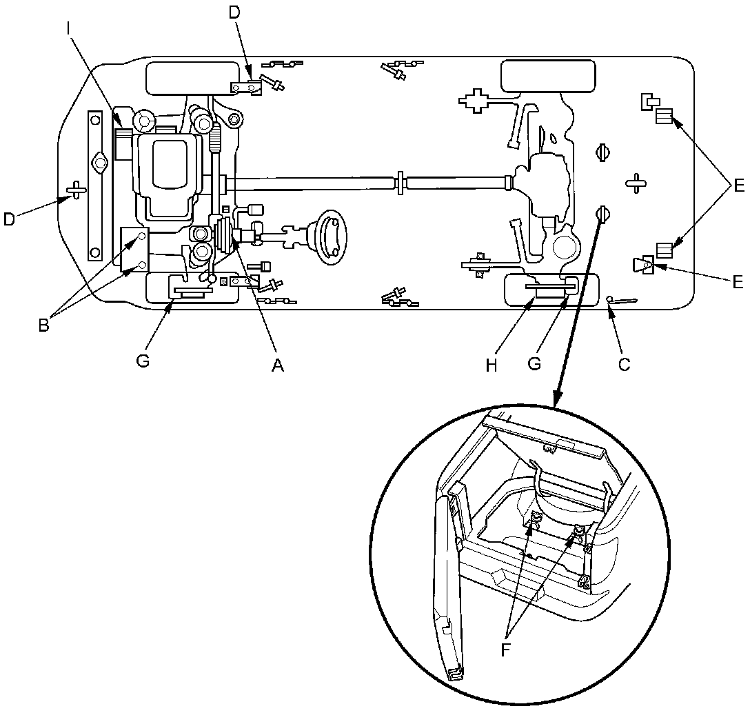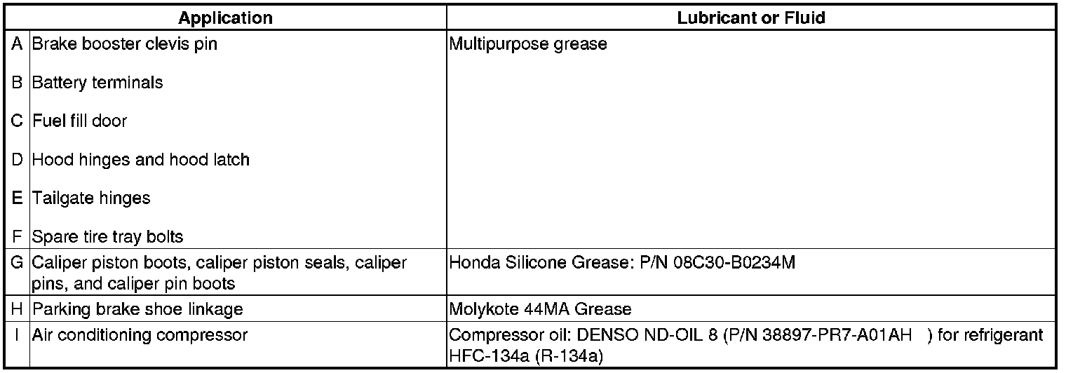- Lubricate the following areas using the recommended lubricants and fluids.