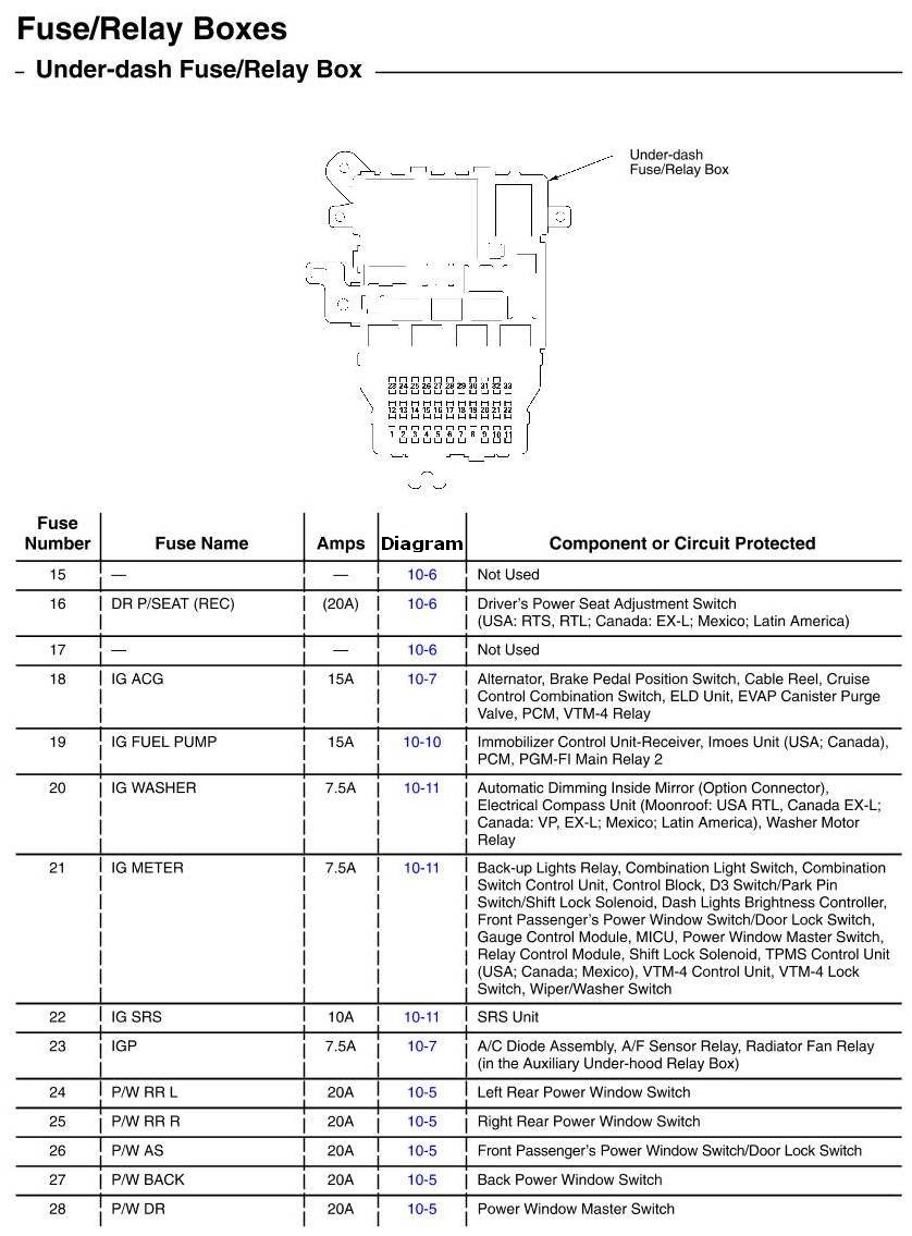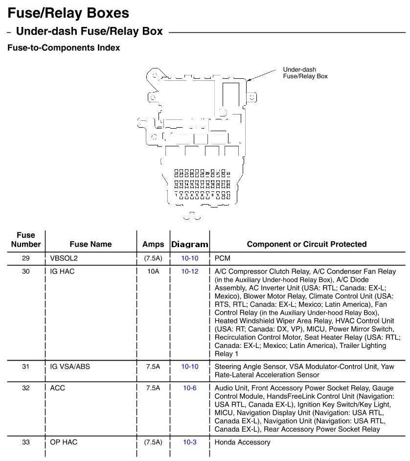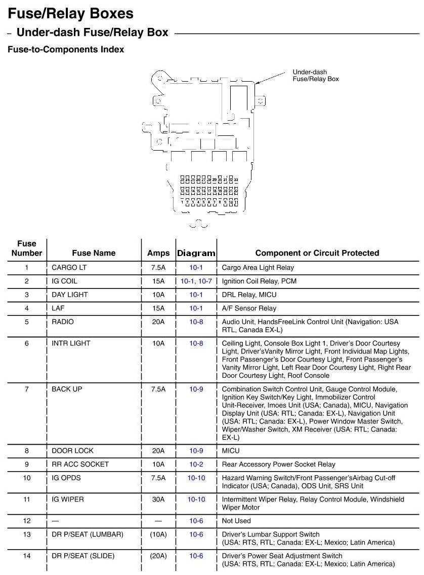 Under-dash Fuse/Relay Box - Fuse-to-Components Index