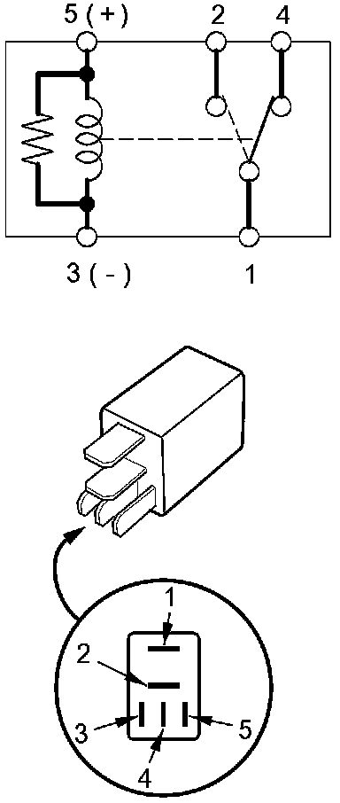 - There should be continuity between terminals No. 1 and No. 2 when power is connected to terminal No. 5 and ground the terminal No. 3.
