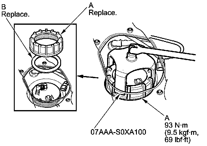 1. Temporarily attach a new base gasket (A) to the fuel tank unit (B), then insert the fuel tank unit partially into the fuel tank.