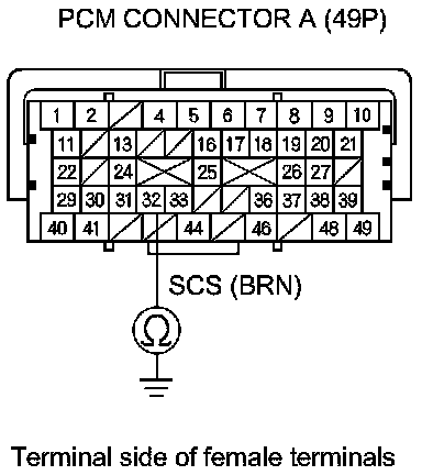 7. Check for continuity between PCM connector terminal A32 and body ground.