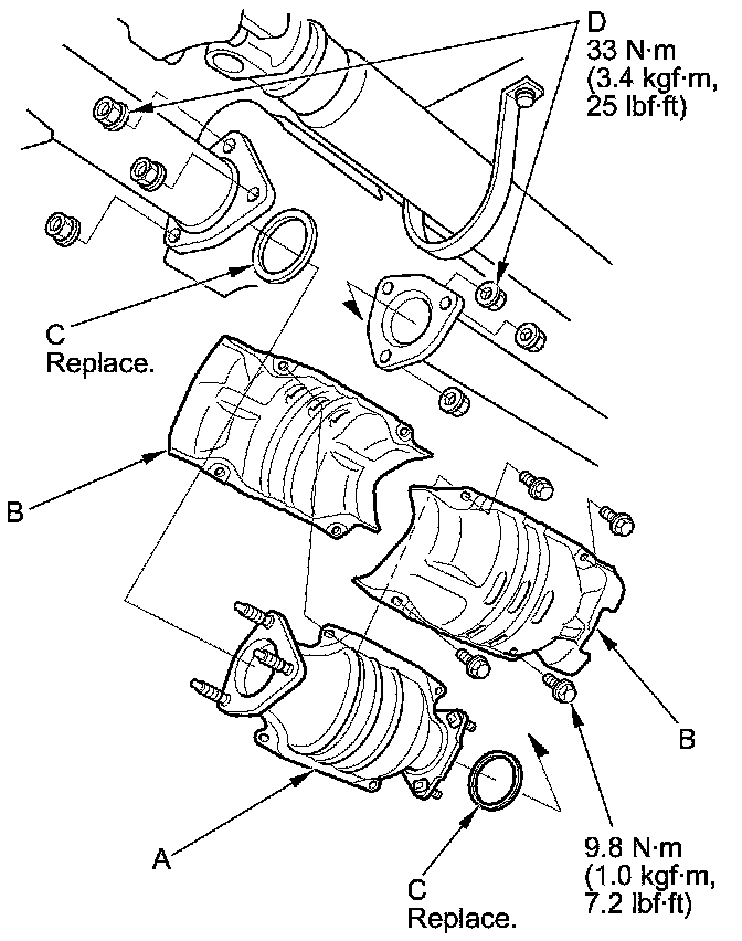 Install the parts in the reverse order of removal with new gaskets (C) and new self-locking nuts (D).