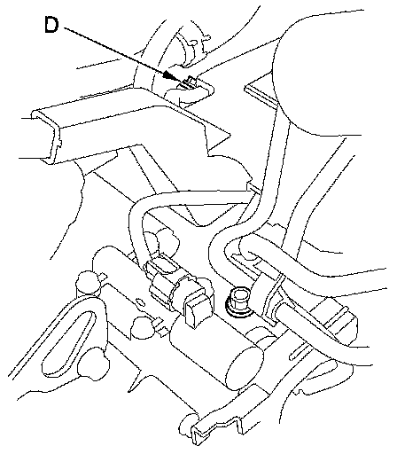13. Remove the engine cover and air intake duct, and connect the A/T oil pressure gauge to the 2nd clutch pressure inspection port (D). Then temporarily install the air intake duct.