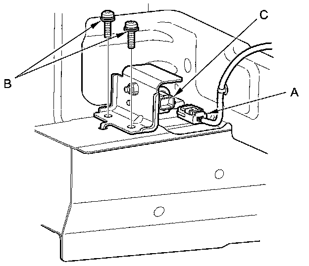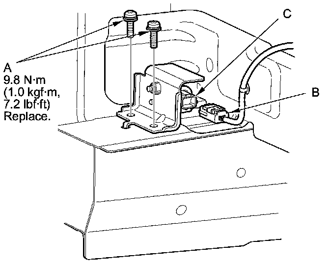 1. Install the front impact sensor with new TORX bolts (A), using a TORX T30 bit. Connect the left engine compartment wire harness or the right engine compartment wire harness 2P connector (B) to the front impact sensor (C).