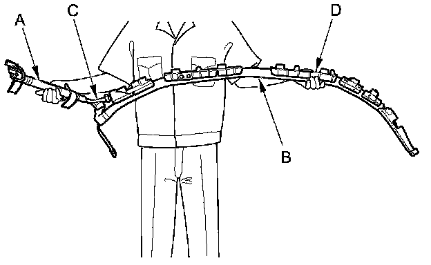 - The side curtain airbag module assembly is a long, jointed part containing an inflator (A), a flexible bag (B), an adapter pipe (C), and a center bracket (D). When removing or installing the side curtain airbag assembly, never: