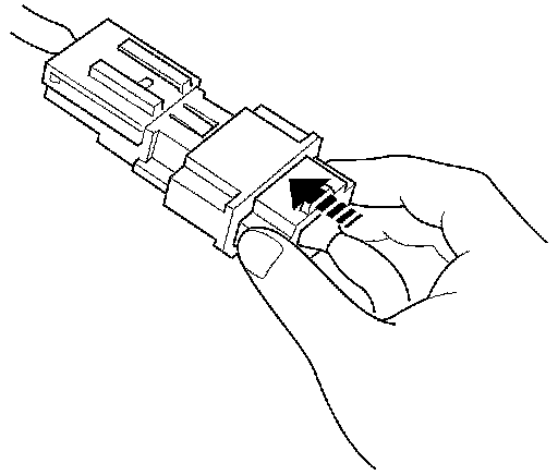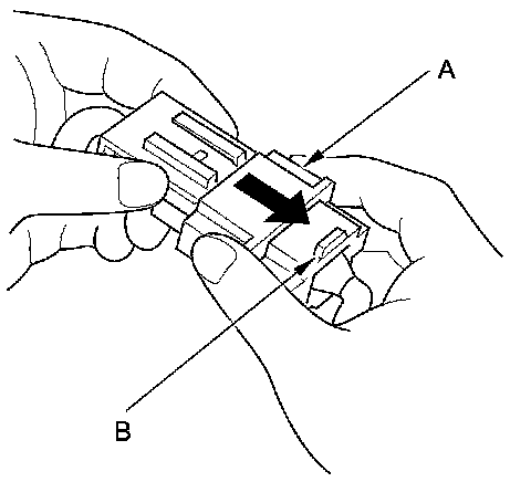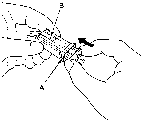 1. To reconnect, hold the pawl-side connector, and press on the back of the sleeve-side connector in the direction shown. As the two connector halves are pressed together, the sleeve (A) is pushed back by the pawl (B). Do not touch the sleeve.