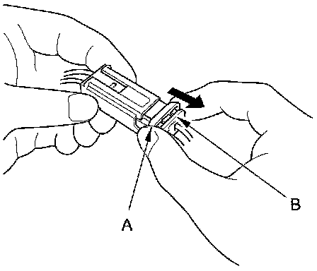 To remove the retainer (A), insert a flat-tip screwdriver (B) between the connector body and the retainer, then carefully pry out the retainer. Take care not to break the connector.