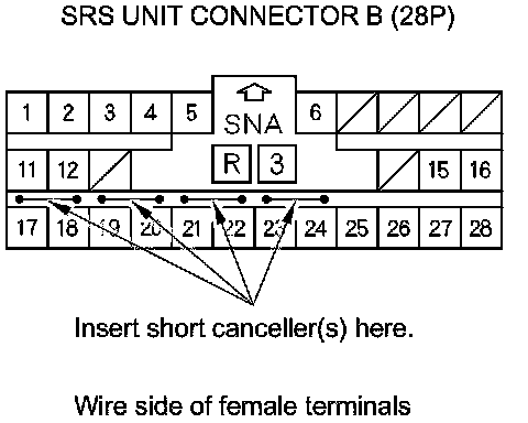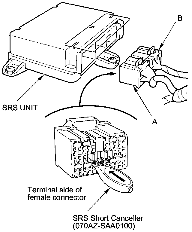 When SRS unit connectors A (28P), or B (28P) are disconnected, a short circuit is automatically created in the connector to prevent accidental deployment of an airbag or tensioner. The circuit may need to be opened when diagnosing the system. Insert an SRS short canceller (No. 070AZ-SAA0100) in the specified cavities when necessary to keep the circuit open for diagnosis.
