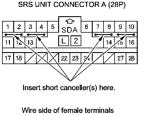 Terminal numbers are shown from the wire side of the female terminals. Insert the SRS short canceller(s) into the cavities on the terminal side of the connector.