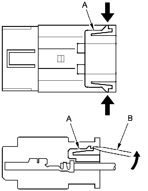 When checking voltage or resistance on this type of connector the first time, you must remove the retainer (A) to insert the tester probe from the wire side.
