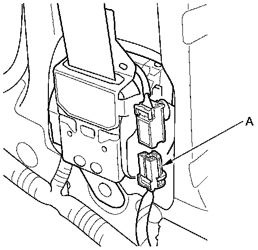 11. Disconnect the floor wire harness 4P connector (A) from the driver's and the front passenger's seat belt tensioner.