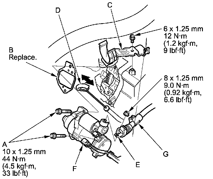 3. Connect the positive starter cable (E) and the S terminal connector (F). Make sure the crimped side of the ring terminal faces away from the starter when you connect it.