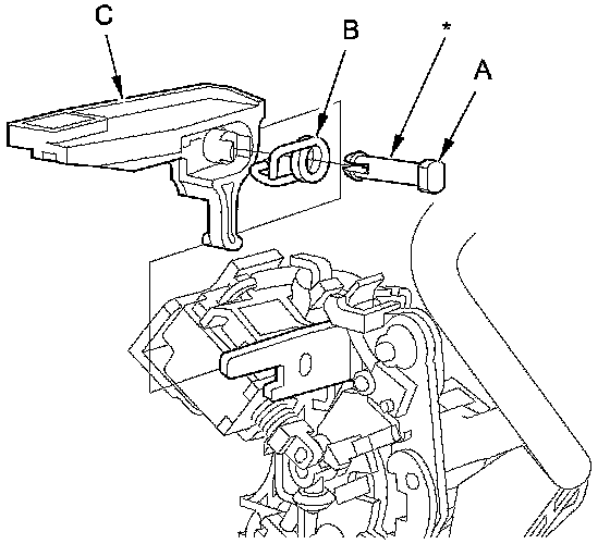 5. Remove the shift lock release pin (A), the spring (B), and the shift lock release (C).