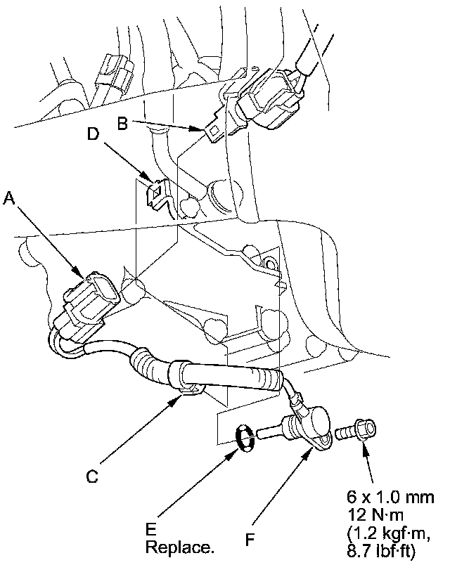 7. Install a new O-ring (E) on a new ATF temperature sensor (F), and install the ATF temperature sensor.