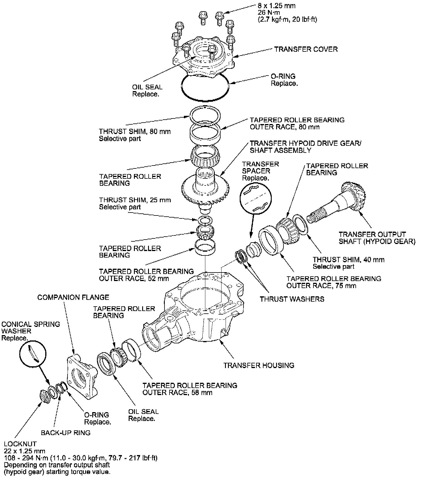 2. Remove the transfer hypoid drive gear/shaft assembly (C), the 25 mm thrust shim (D), and the tapered roller bearing (E).