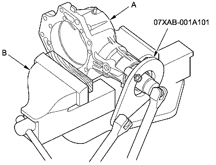 6. Secure the transfer housing (A) in a bench vise (B) with soft jaws. To prevent damage to the transfer housing, always use soft jaws or equivalent materials between the transfer housing and the vise.