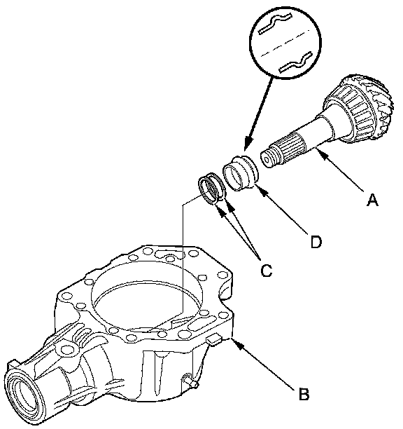10. Remove the transfer output shaft (hypoid gear) (A) from the transfer housing (B), then remove the thrust washers (C) and the transfer spacer (D) from the transfer output shaft (hypoid gear).