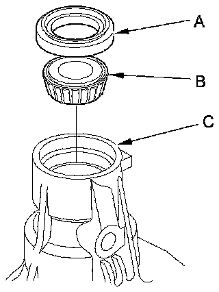 11. Remove the oil seal (A) and the tapered roller bearing (B) from the transfer housing (C).
