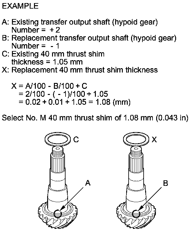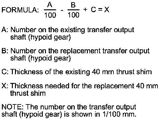 1. Select the 40 mm thrust shim if the transfer output shaft (hypoid gear) is replaced. Calculate the thickness of the 40 mm thrust shim using the following formula, and select the shim from the following table.