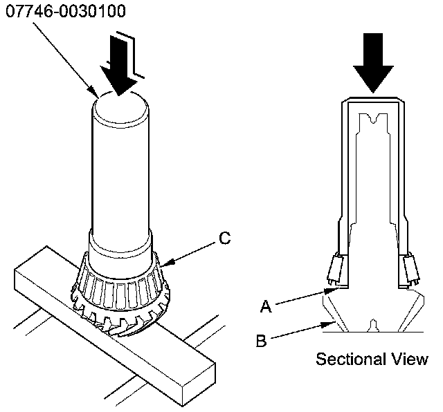 3. Install the 40 mm thrust shim (A) on the transfer output shaft (hypoid gear) (B), then install the tapered roller bearing (C) using the driver handle (40 mm I.D.) and a press.