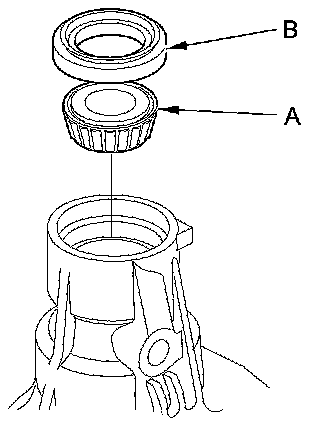 4. Place the tapered roller bearing (A) on the tapered roller bearing outer race of the companion flange side of the transfer housing, and install a new oil seal (B).