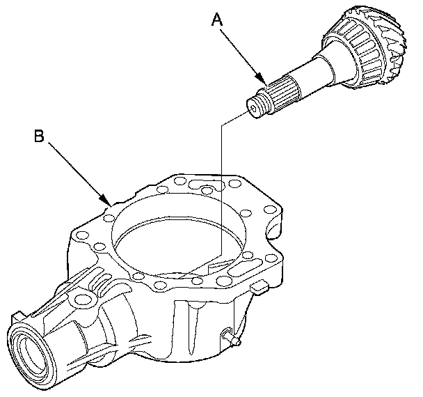 6. Install the transfer output shaft (hypoid gear) (A) in the transfer housing (B). Do not install the transfer spacer and the thrust washers on the transfer output shaft (hypoid gear).