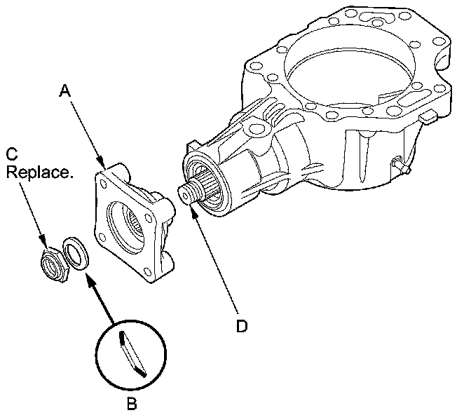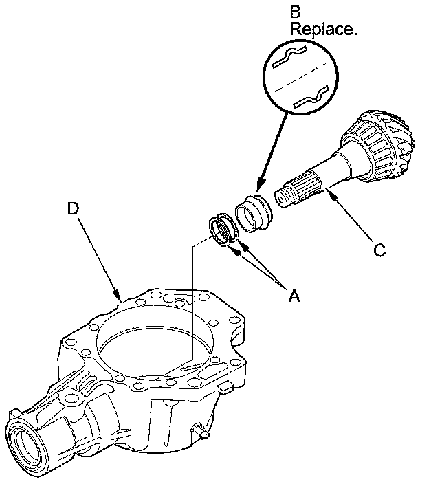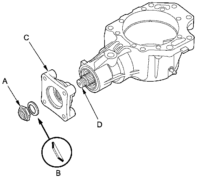 7. Install the companion flange (A), the conical spring washer (B) (in the direction shown), and a new locknut (C) on the transfer output shaft (hypoid gear) (D). Do not install the O-ring and the back-up ring.
