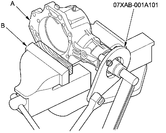 8. Secure the transfer housing (A) in a bench vise (B) with soft jaws. To prevent damaging the transfer housing, always use soft jaws or equivalent materials between the transfer housing and the vise.