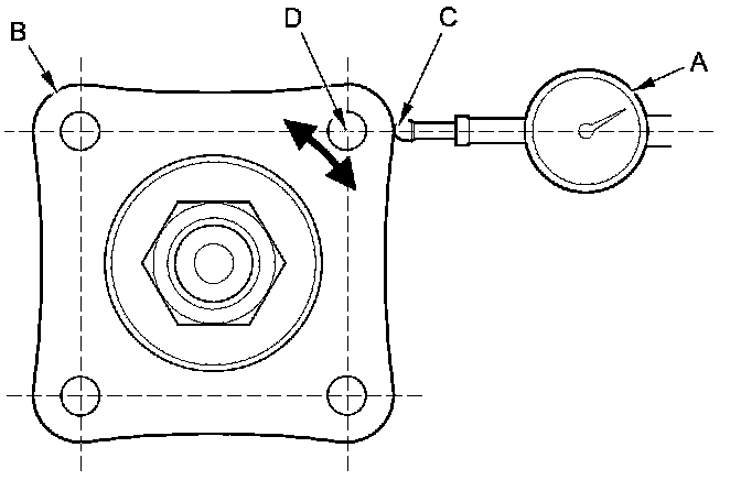 16. Set a dial indicator (A) on the transfer companion flange (B); position the dial indicator tip (C) on the direct extension of the bolt hole center (D).