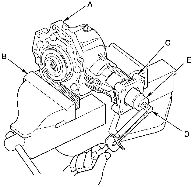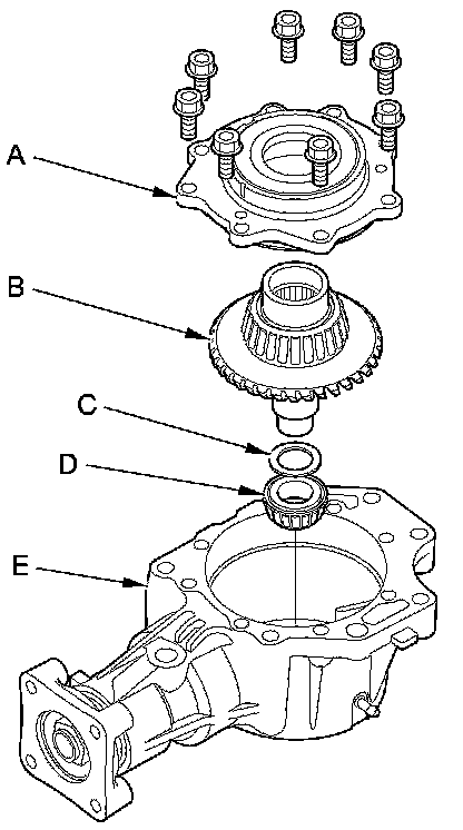 21. Remove the transfer cover (A), the transfer hypoid drive gear/shaft assembly (B), the 25 mm thrust shim (C), and the tapered roller bearing (D) from the transfer housing (E) after adjusting the transfer gear backlash or transfer gear tooth contact.