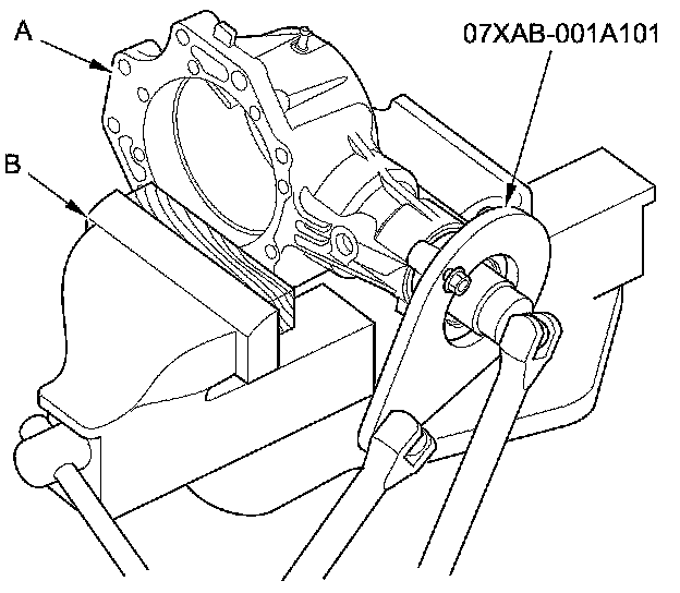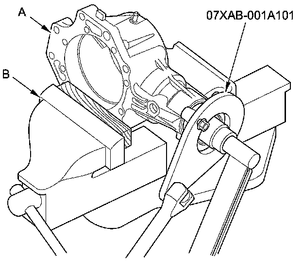 22. Secure the transfer housing (A) in the bench vise (B) with soft jaws, then install the flange holder on the companion flange. To prevent damage to the transfer housing, always use soft jaws or equivalent materials between the transfer housing and the vise.